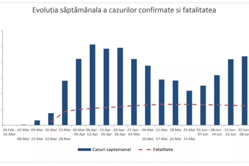 GRAFIC INSP: Evoluția săptămânală a cazurilor confirmate și fatalitatea, de la începutul epidemiei de coronavirus 26 februarie - 28 iunie 2020