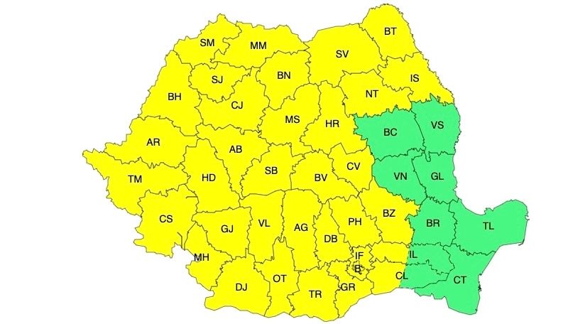 ANM a emis atenționări de tip Cod Galben pentru mai multe zone ale țării, vizând două fenomene meteo extreme