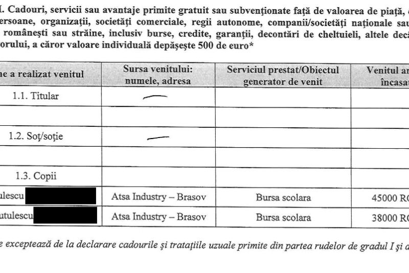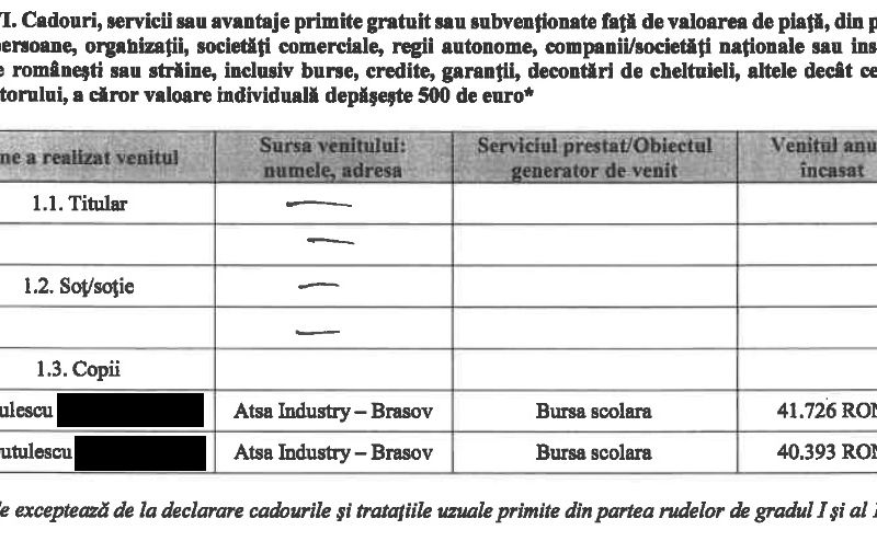 Potrivit declaratiilor de avere pe anii 2020-2021 depuse de sotia lui Augustin Duțulescu, Maria Raluca Dutulescu, cei doi copii ai cuplului au primit burse scolare și de la ATSA Industry Brasov.