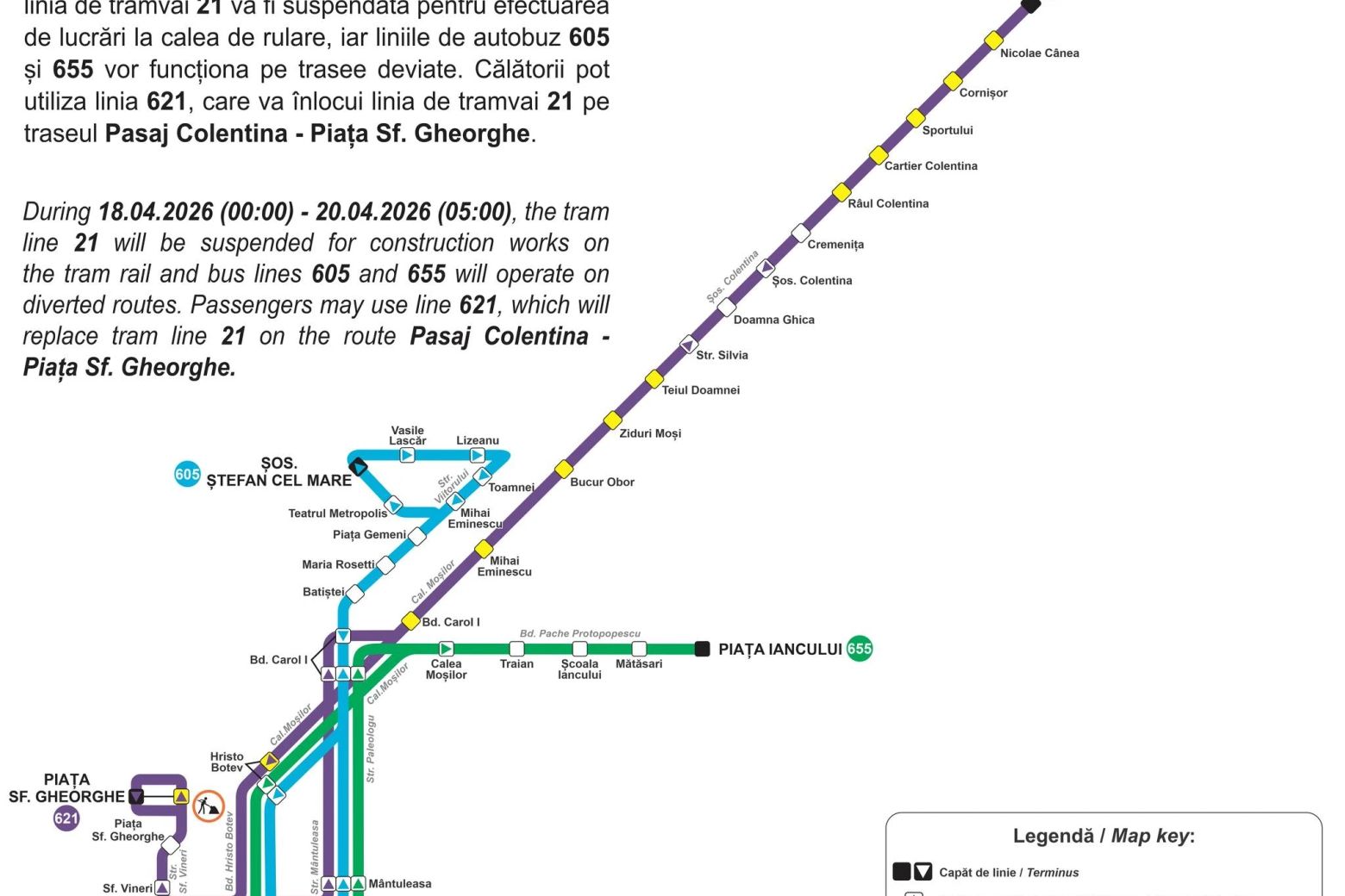 Tramvaiele liniei 21 nu vor circula sâmbătă și duminică, pe 18 și 19 aprilie, iar mai multe linii de autobuz vor avea trasee modificate ca urmare a unor lucrări la macazul de la intersecția Calea Moșilor - Lipscani - Cavafii Vechi. TPBI anunță înființarea unei linii navetă pentru preluarea călătorilor.