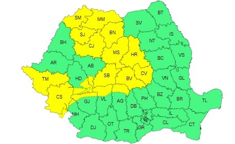 Codul galben vizează judeţele Satu Mare, Maramureş, Sălaj, Bistriţa-Năsăud, Cluj, Mureş, Harghita, Covasna, Braşov, Sibiu, Caraş-Severin, Timiş şi unele zone ale judeţelor Hunedoara, Alba, Mehedinţi, Gorj, Vâlcea şi Argeş.