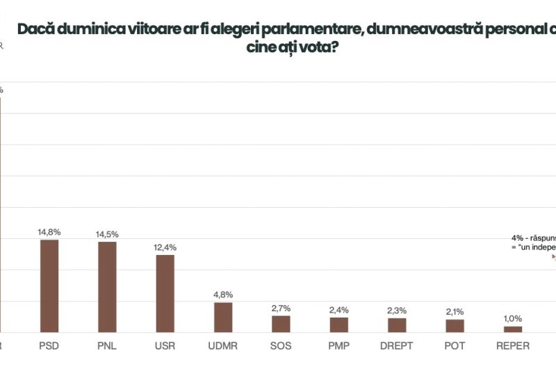 Răspunsul la întrebarea "Dacă duminica viitoare ar fi alegeri parlamentare, dumneavoastră personal cu cine ați vota?" arată o realitate care zdruncină din temelii Guvernul Bolojan: în topul preferințelor alegătorilor se află AUR, cu 37,5%. La mare distanță sunt PSD (14,8%) și PNL (14,5%), în vreme ce USR abia depășește pragul de 12% - 12,4%, mai exact, adună, cu greu, reziștii.