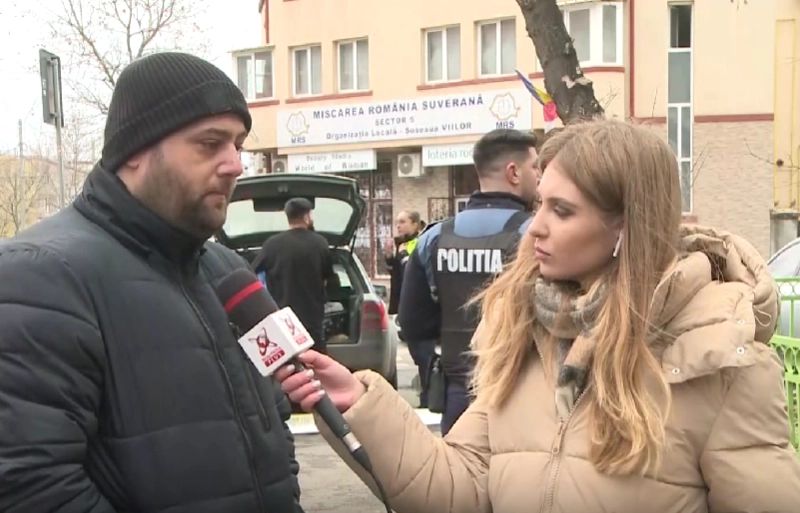 Fiul femeii agresate de Cătălin Coman. Pe fundal se observă sediul "Mișcarea România Suverană".