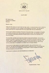 Scrisoare de susținere din partea lui Donald Trump pentru Cozmin Gușă, candidat independent la președinția României