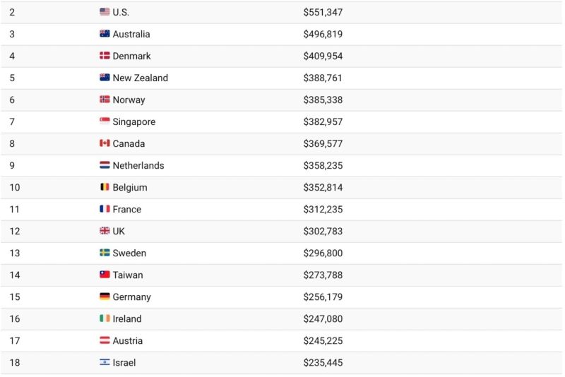 Pe locul doi se află Statele Unite ale Americii, cu o avere medie pe persoană de 551.347 dolari. Podiumul este completat de Australia, cu o avere medie de 496,819 dolari. Următoarele locuri în clasamentul celor mai bogate țări din lume urmează Danemarca, Noua Zeelandă, Norvegia, Singapore, Canada, Olanda, Belgia, Franța și Marea Britanie.