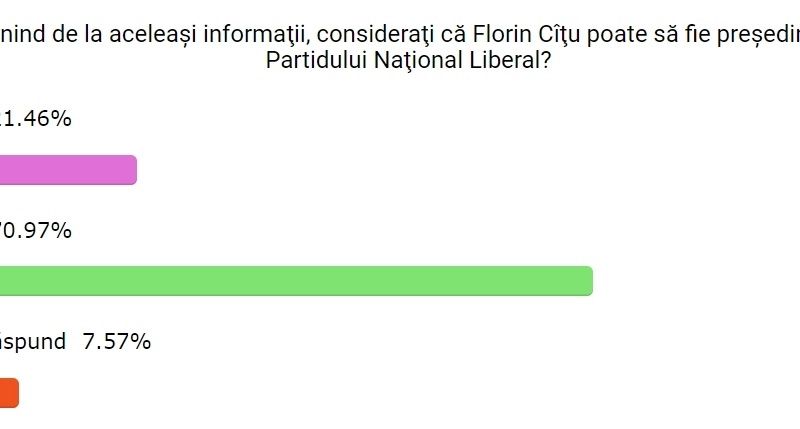 Florin Cîțu nu ar trebui să fie președintele PNL după ce a fost condamnat în SUA pentru că a condus autoturismul sub influenţa alcoolului și pentru că justiţia americană l-a acuzat şi pentru că nu a mai returnat 7.000 de dolari împrumutaţi de la o bancă. Asta au indicat majoritatea respondenților la întrebarea dacă „Florin Cîţu poate să fie preşedinte al Partidului Naţional Liberal?”.