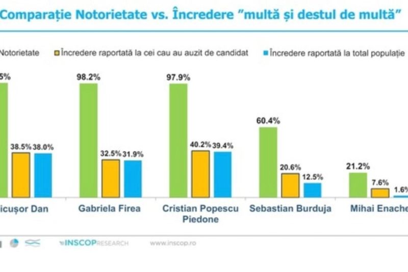 Nicuşor Dan conduce şi în topul notorietăţii, pe locul al doilea aflându-se Gabriela Firea, iar pe al treilea, Cristian Popescu Piedone. Cristian Popescu Piedone conduce, însă, în topul încrederii, fiind urmat de Nicuşor Dan şi de Gabriela Firea.