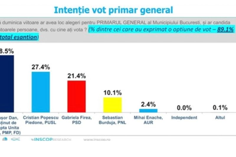 Actualul primar al Capitalei, Nicuşor Dan, se află pe primul loc în intenţiile de vot ale bucureştenilor pentru postul de primar general, cu 38,5 % din opţiuni, urmat de Cristian Popescu Piedone - 27,4% şi de Gabriela Firea - 21,4%, conform unui sondaj realizat de INSCOP.