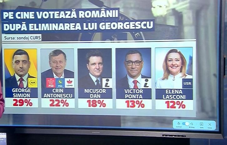 Daca ne uitam pe rezultatele sondajului CURS, vedem ca George Simion conduce clasamentul preferintelor la aceste alegeri prezidentiale. 29% dintre voturi ar urma sa obtina, conform sondajului, liderul suveranistilor. Pe locul al doilea se plaseaza Crin Antonescu cu 22 de procente, pe locul al treilea Nicusor Dan care candideaza independent (18%), pe locul al patrulea abia Victor Ponta (13%), la doar un procent distanta de candidatul USR Elena Lasconi (12%), cea care la celelalte alegeri a reusit sa ajunga in turul al doilea.